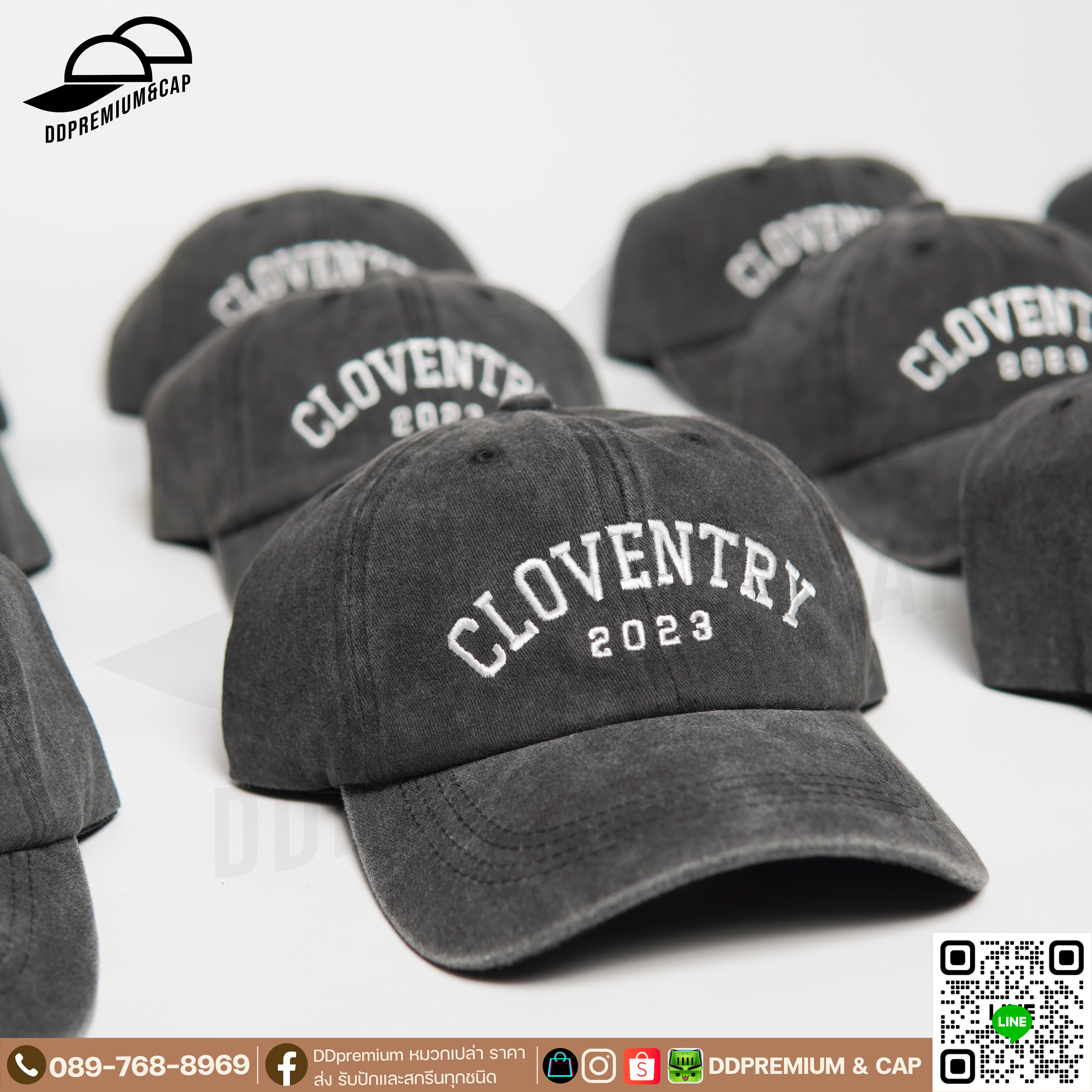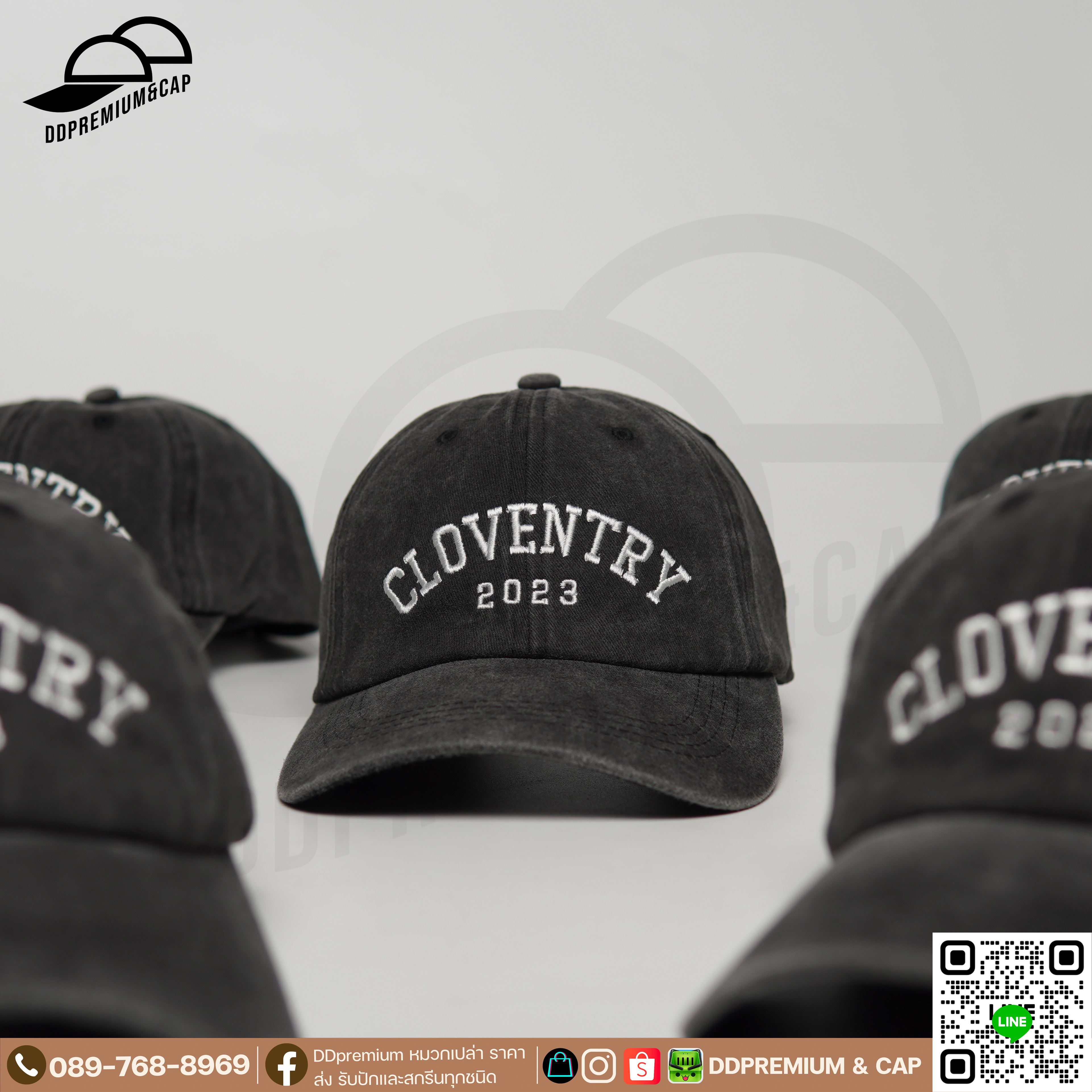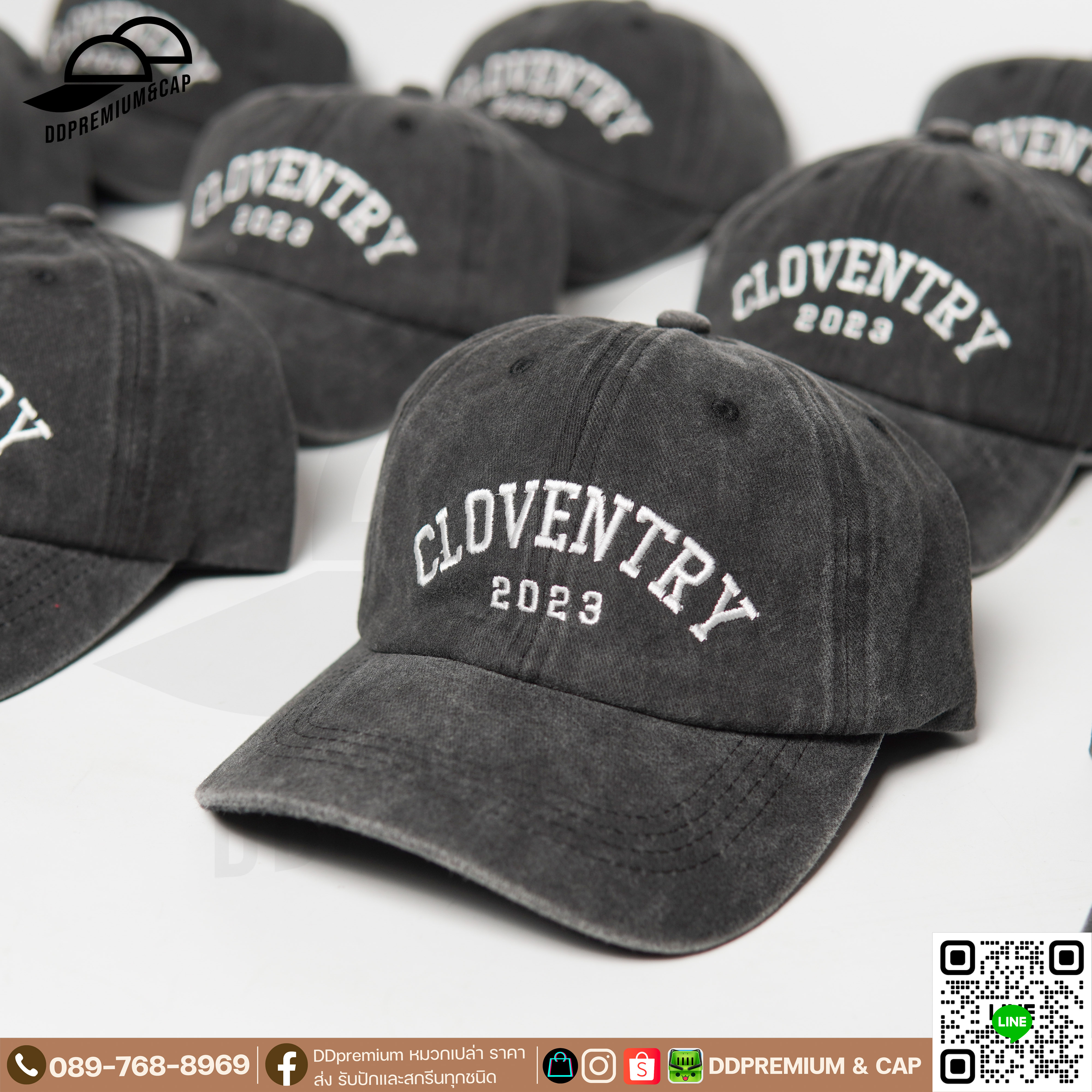 CLOVENTRY2023 - หมวกแก๊ปหน้านิ่ม (รุ่นฟอก) ปักตัวอักษร 1ตำแหน่ง 2บรรทัด เข็มขัดปรับระดับ