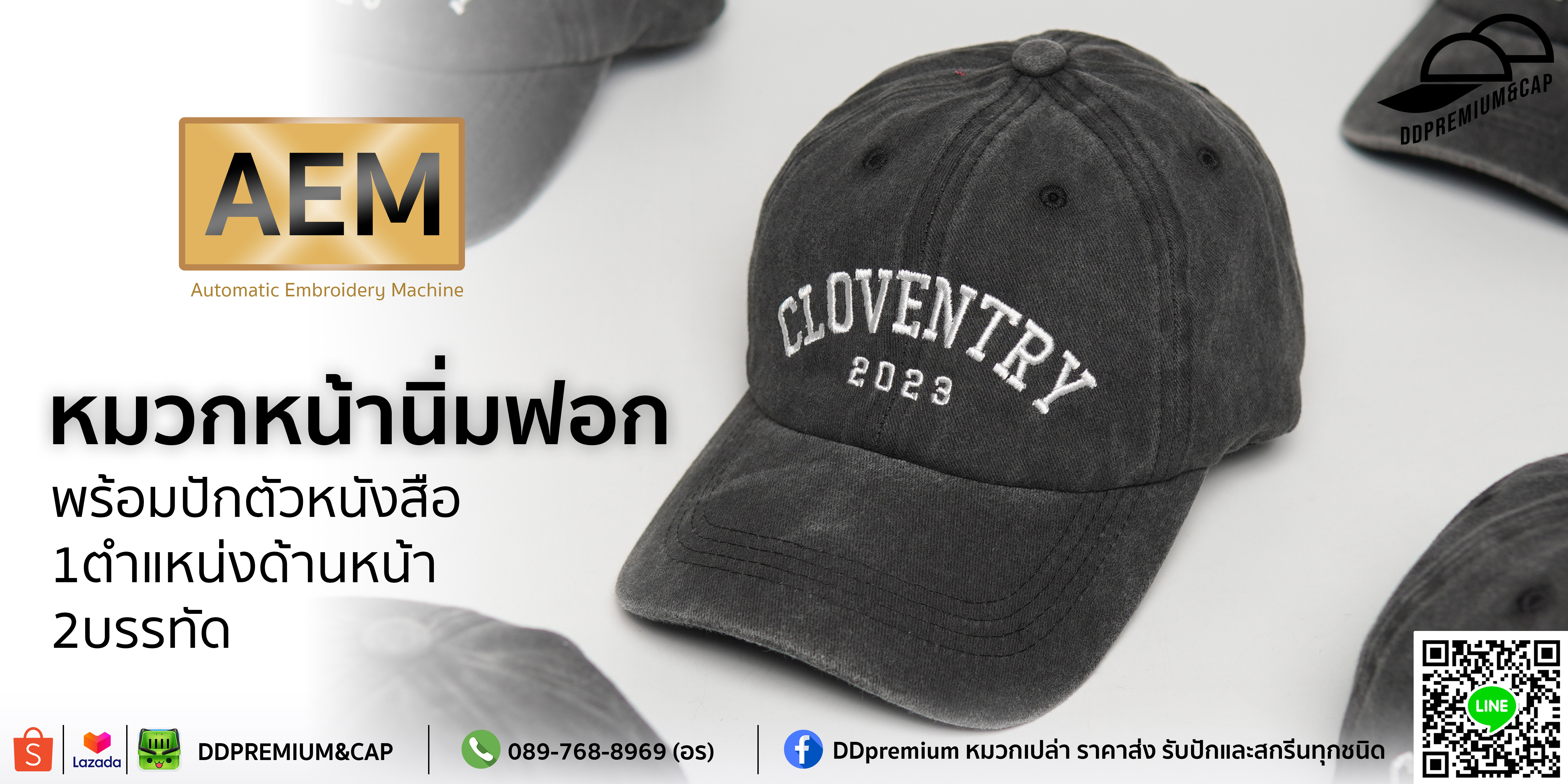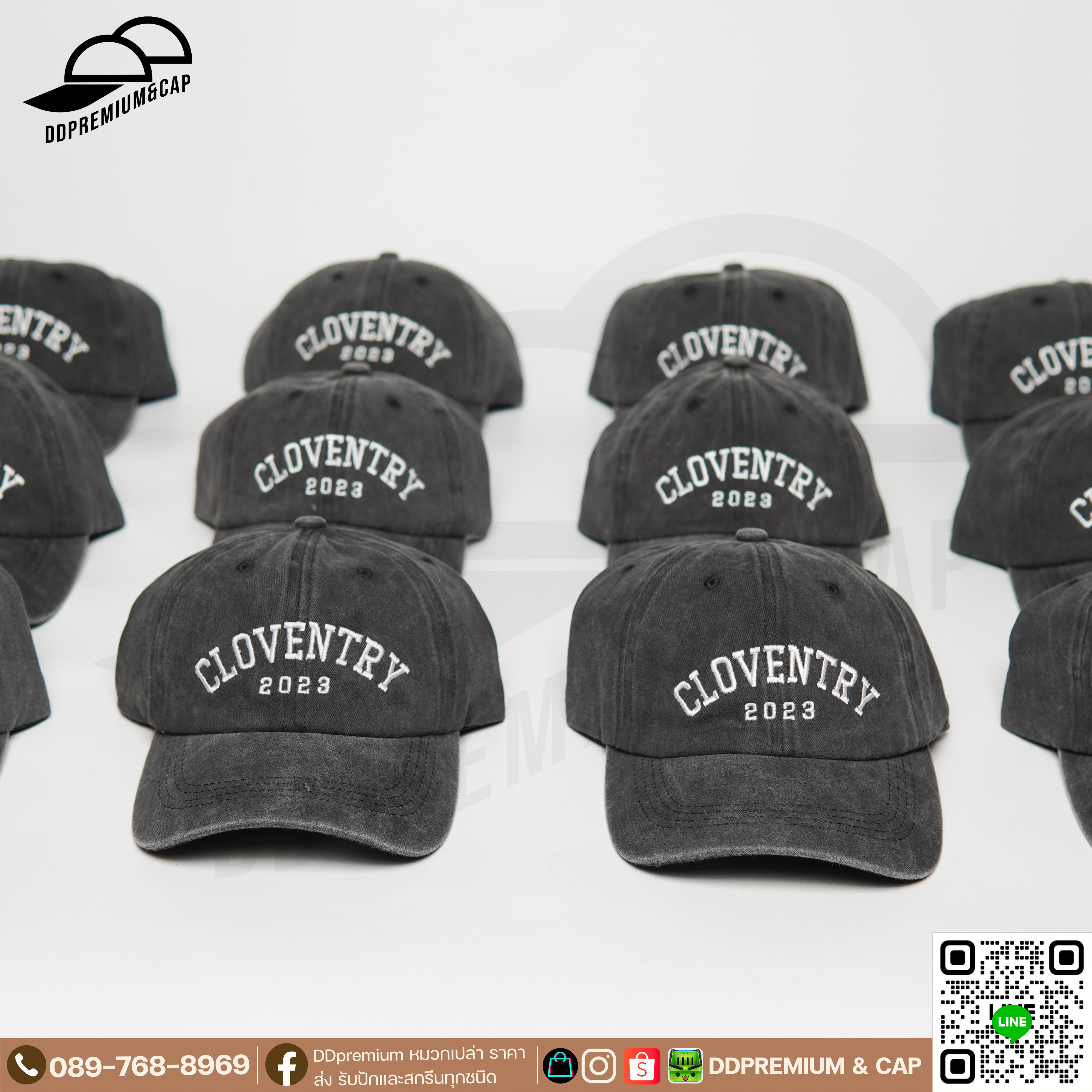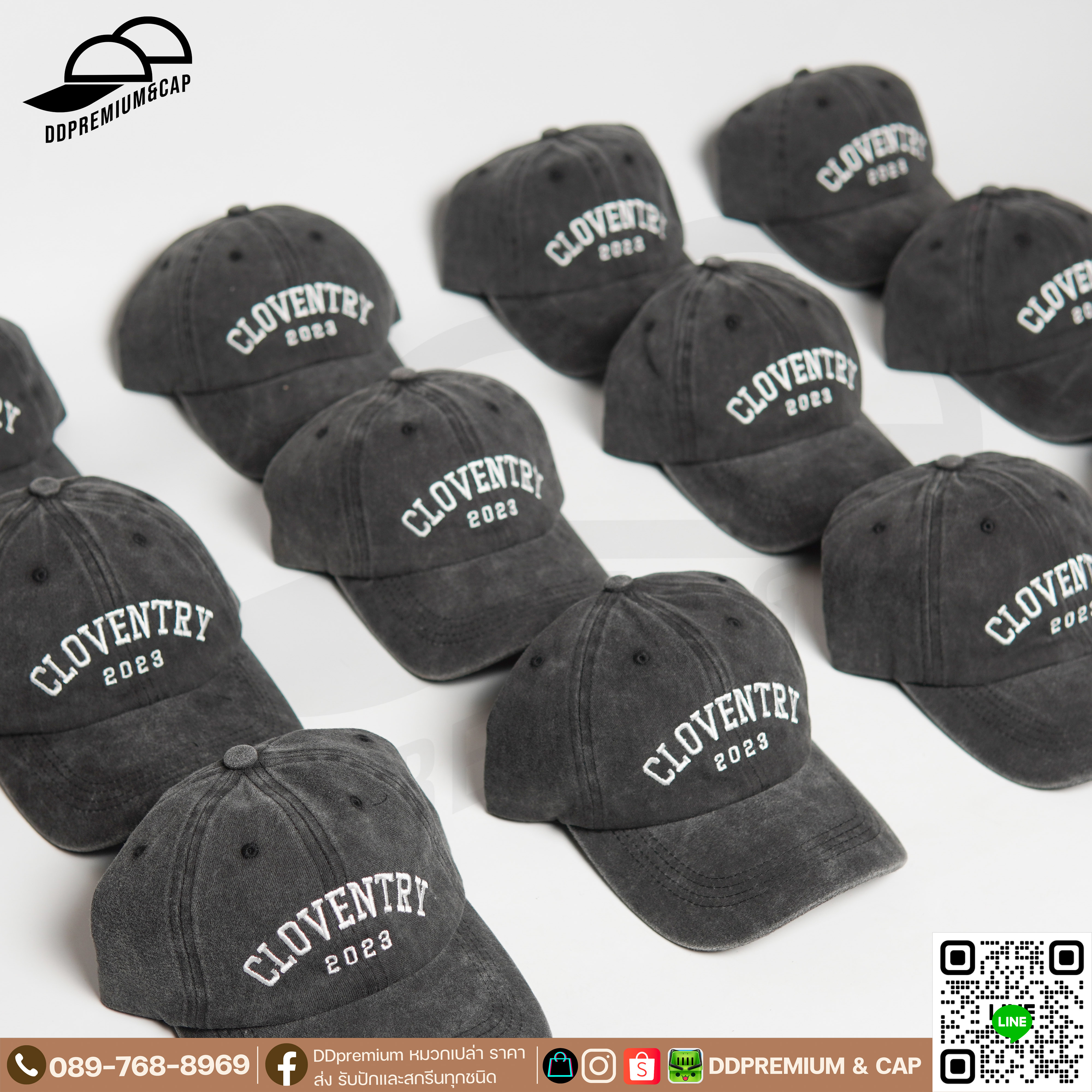 CLOVENTRY2023 - หมวกแก๊ปหน้านิ่ม (รุ่นฟอก) ปักตัวอักษร 1ตำแหน่ง 2บรรทัด เข็มขัดปรับระดับ