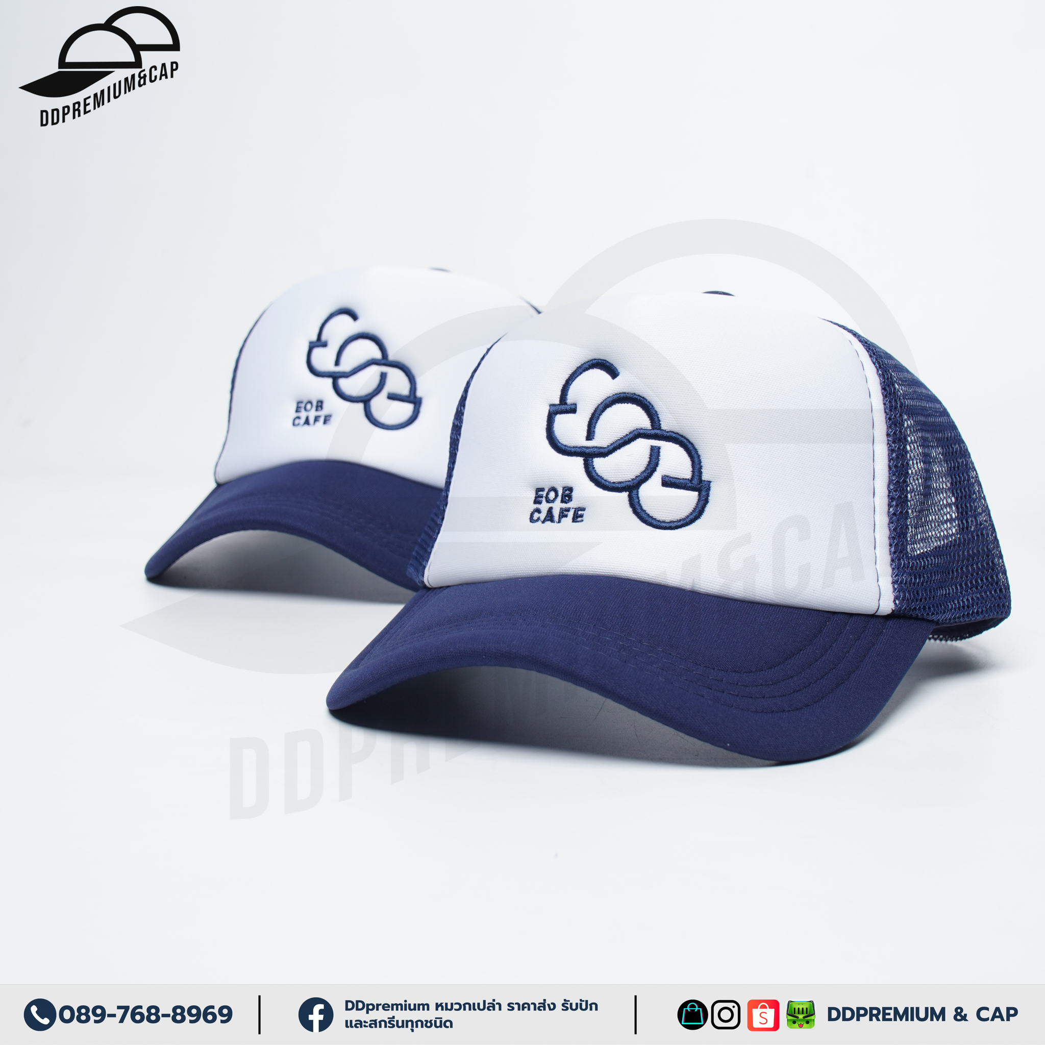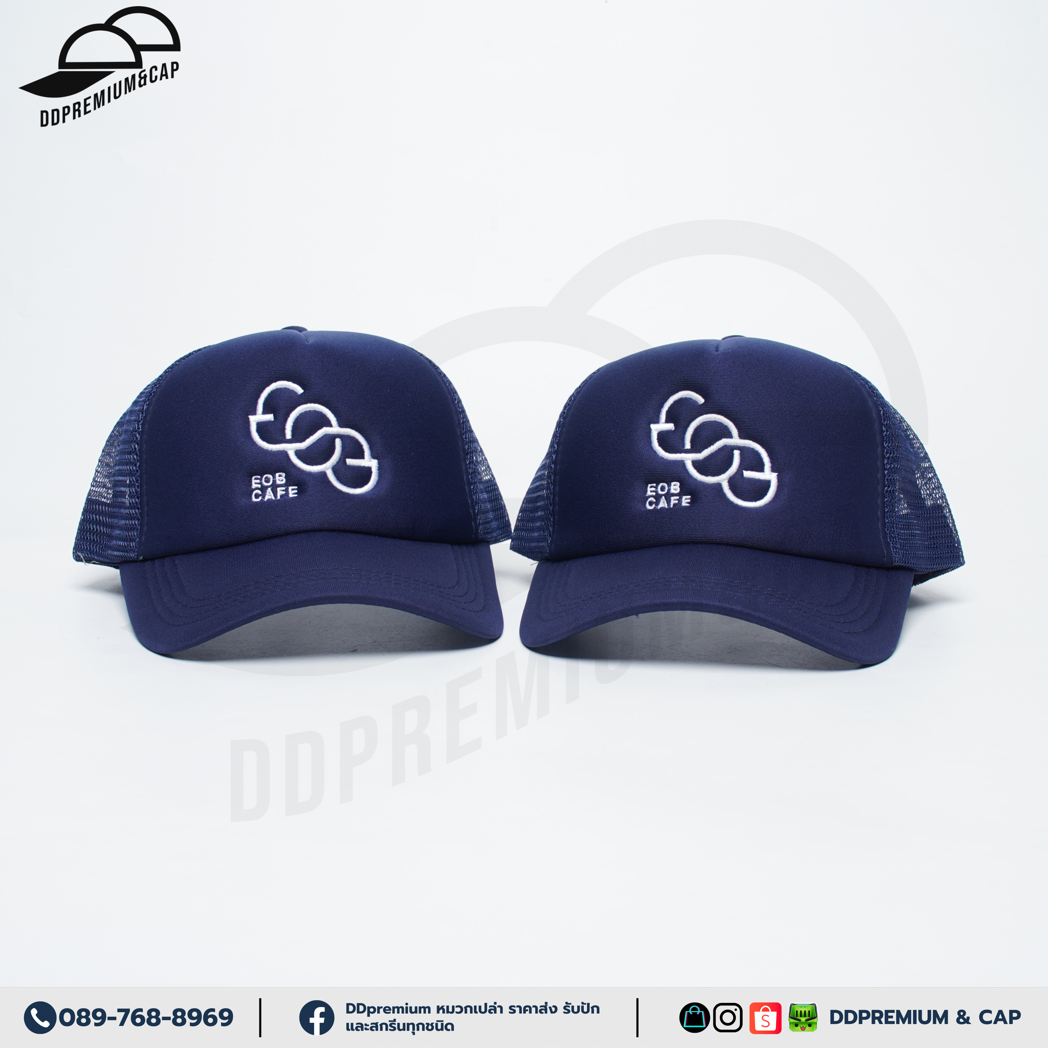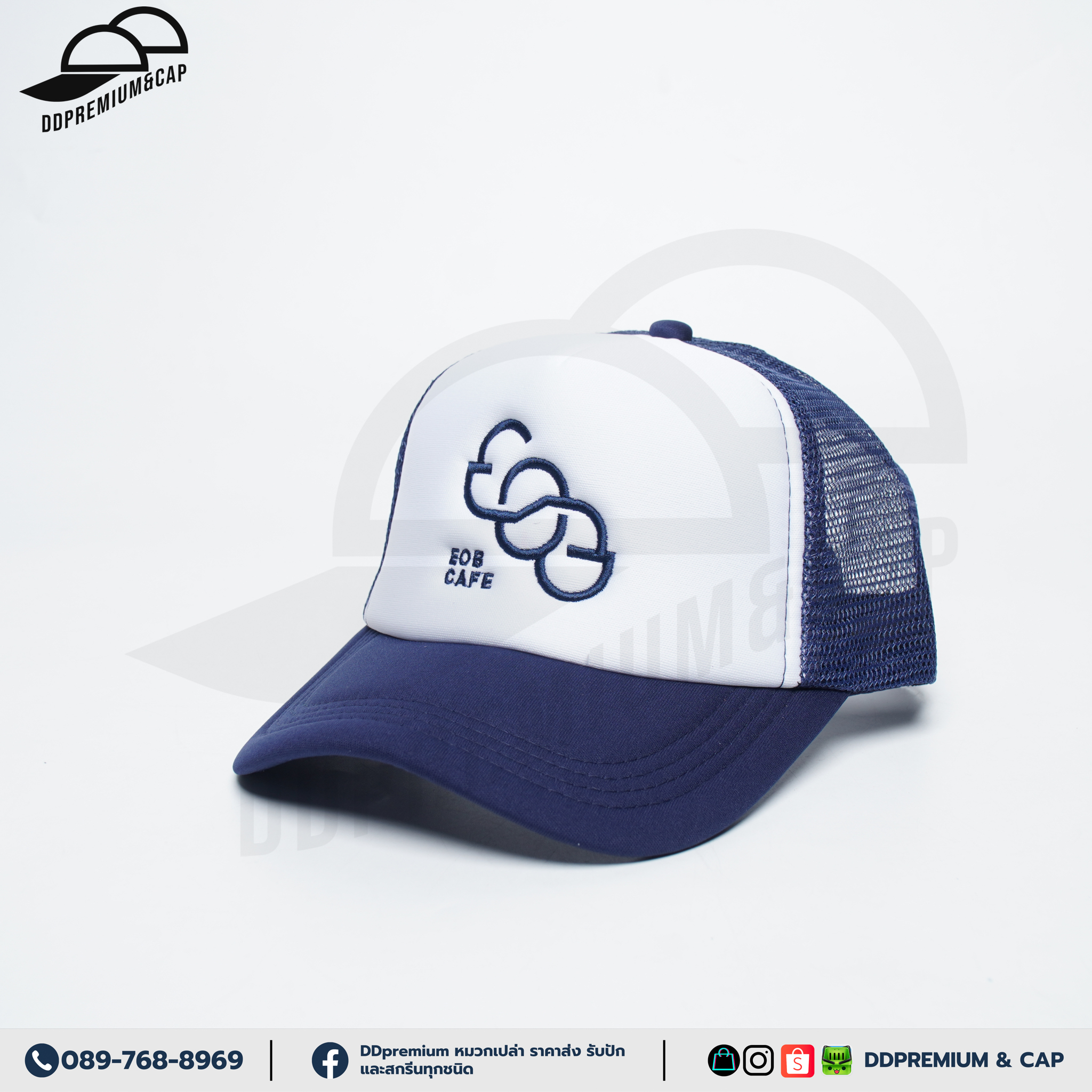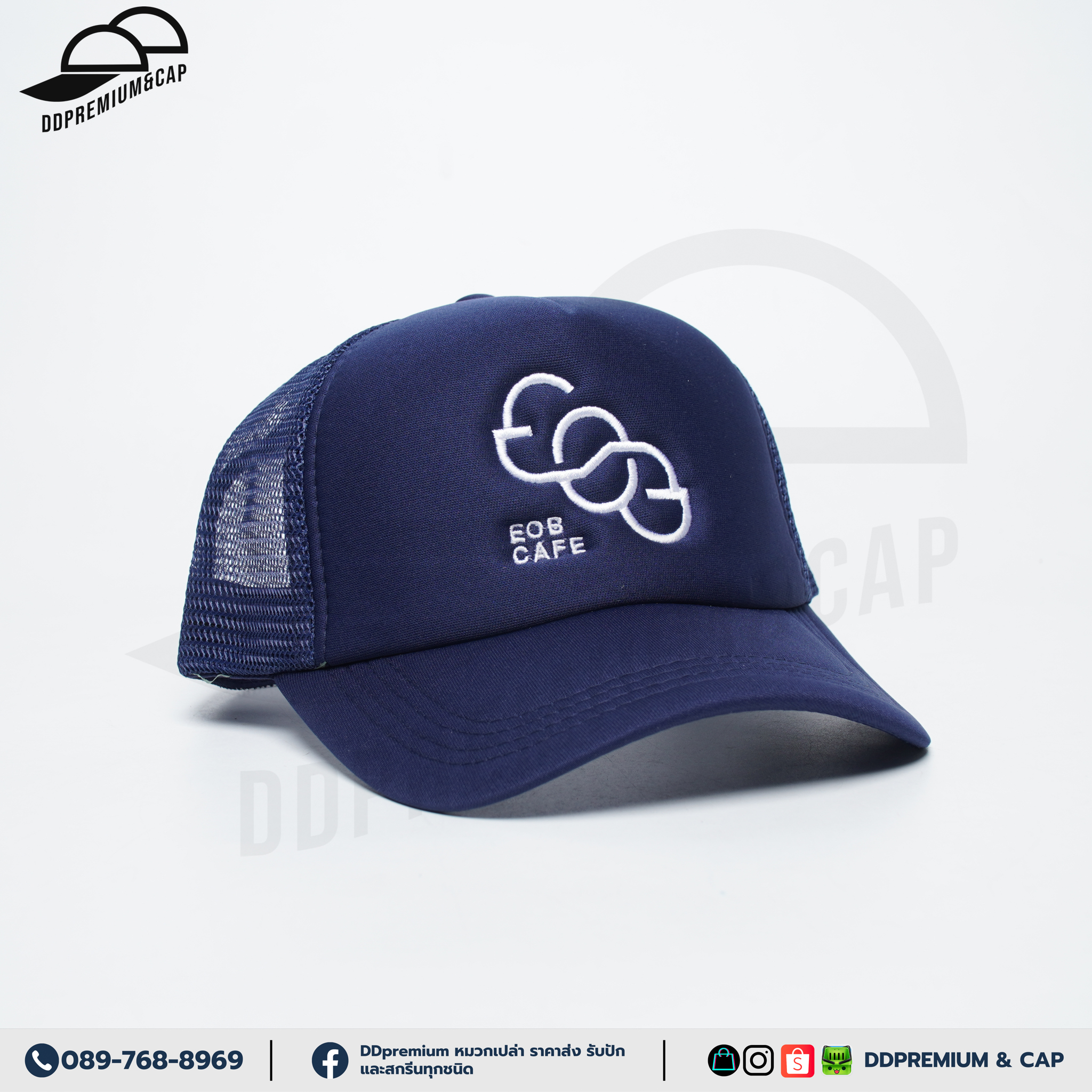 EOB CAFE - หมวกแก๊ปหน้าฟองน้ำหลังตาข่าย พร้อมปักโลโก้ด้านหน้า 1ตำแหน่ง ที่ปรับ Snapback
