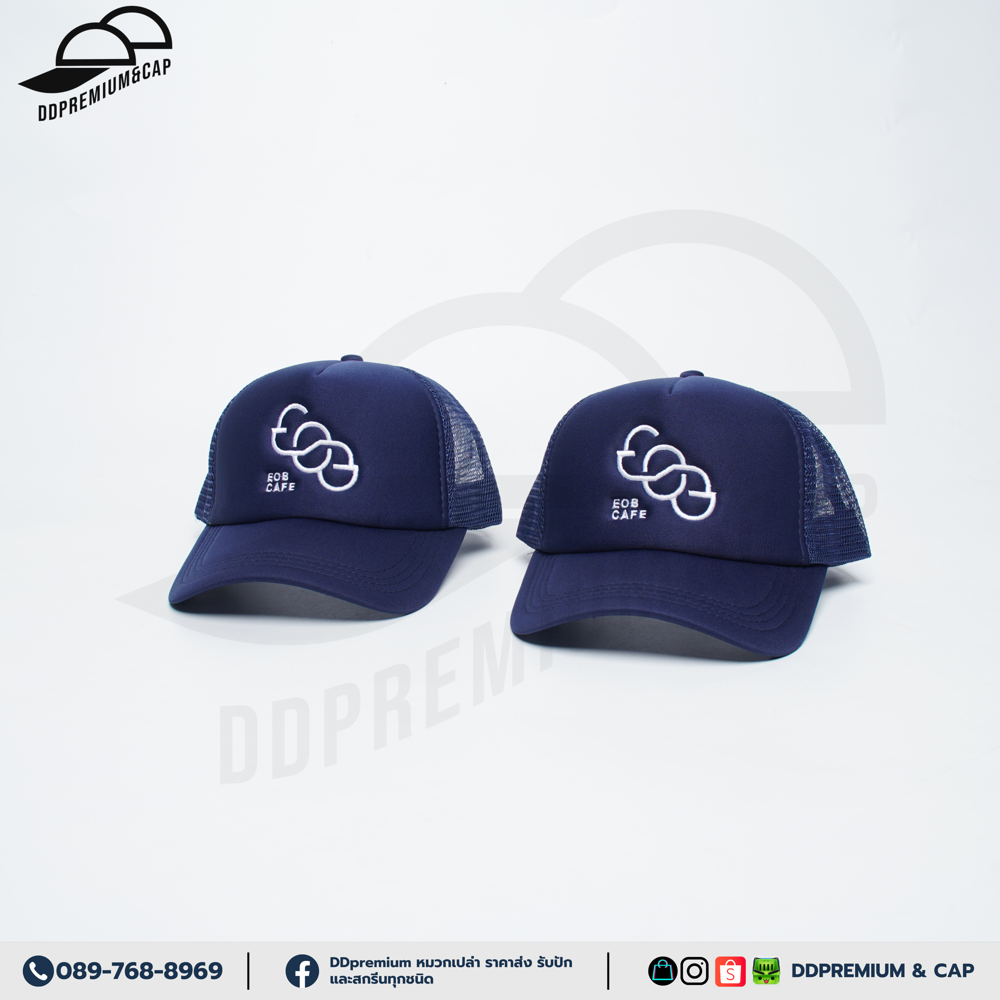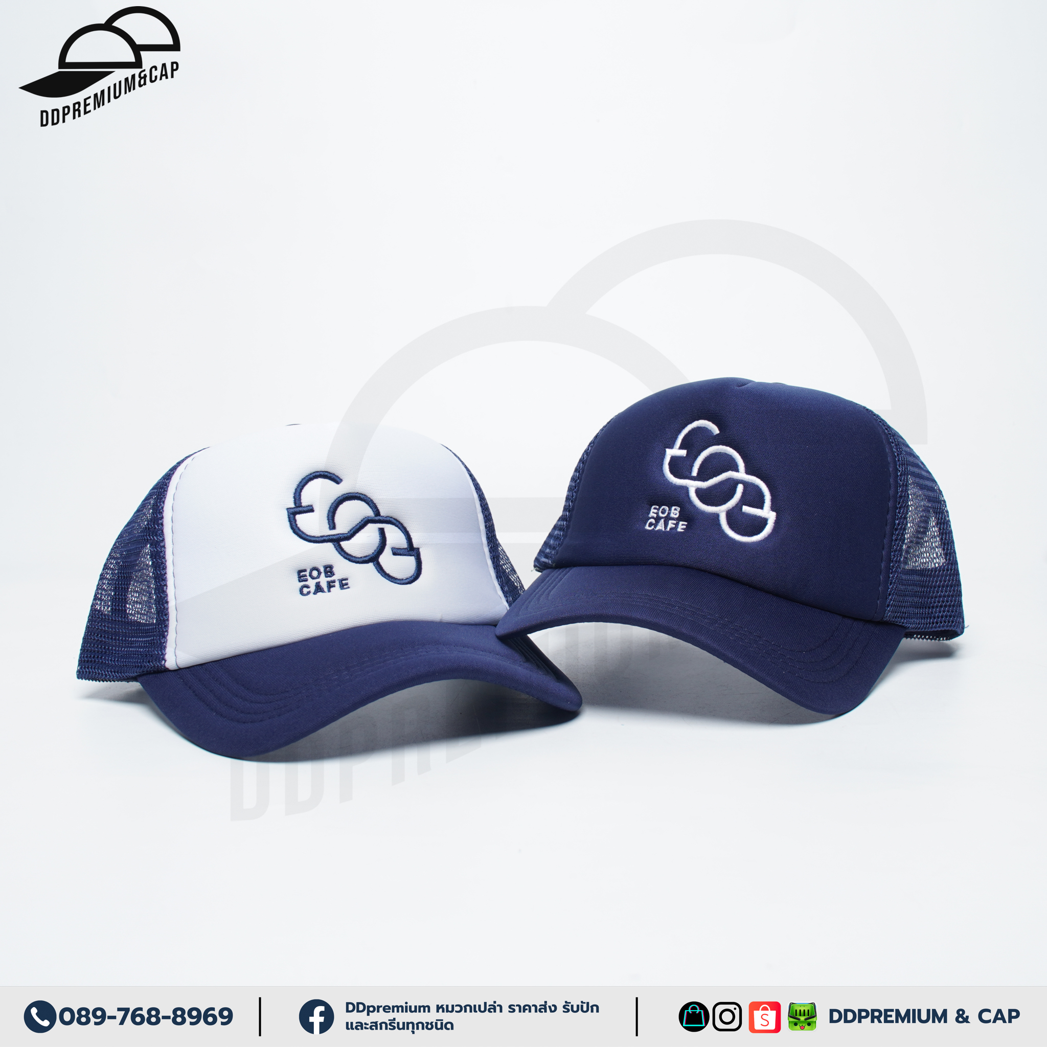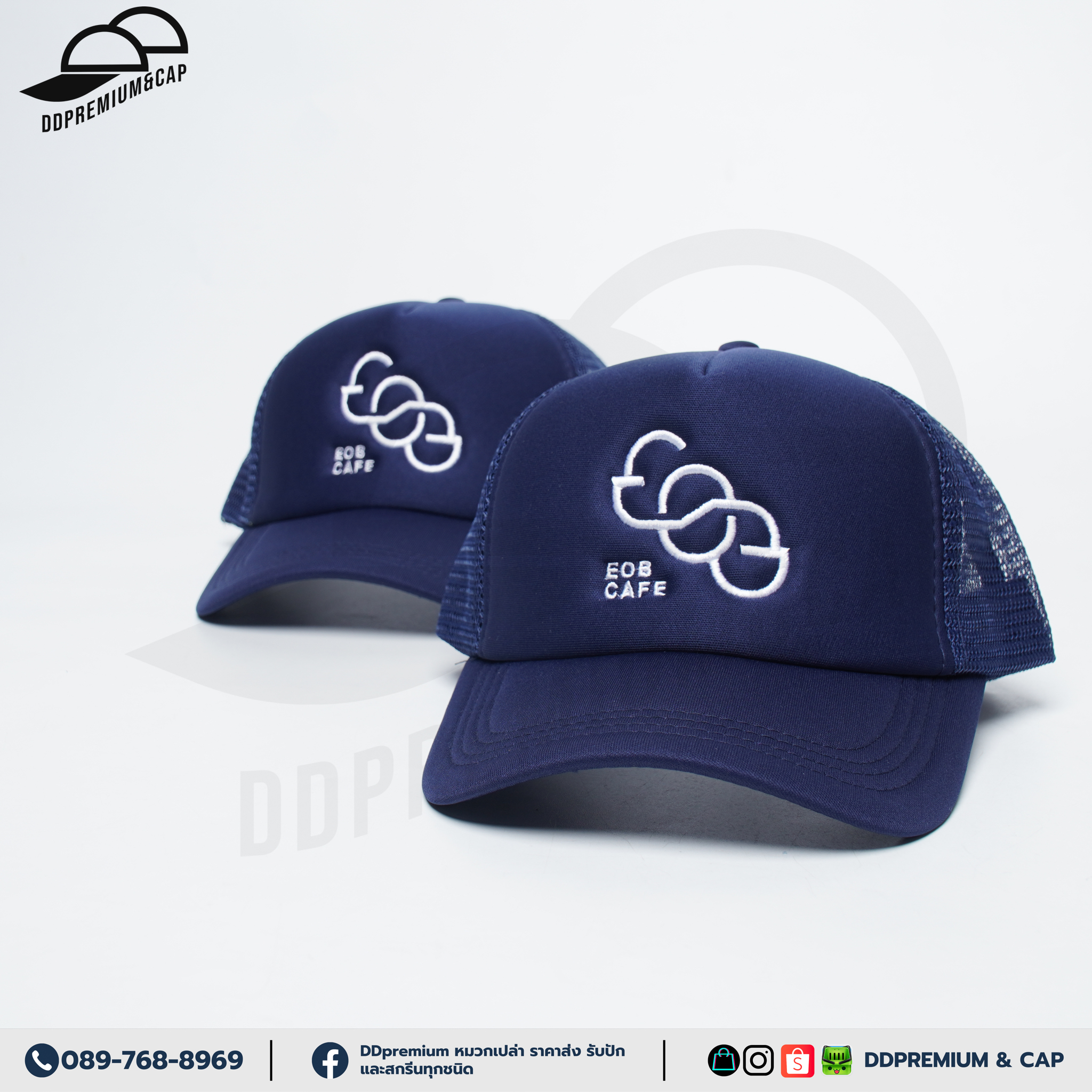 EOB CAFE - หมวกแก๊ปหน้าฟองน้ำหลังตาข่าย พร้อมปักโลโก้ด้านหน้า 1ตำแหน่ง ที่ปรับ Snapback