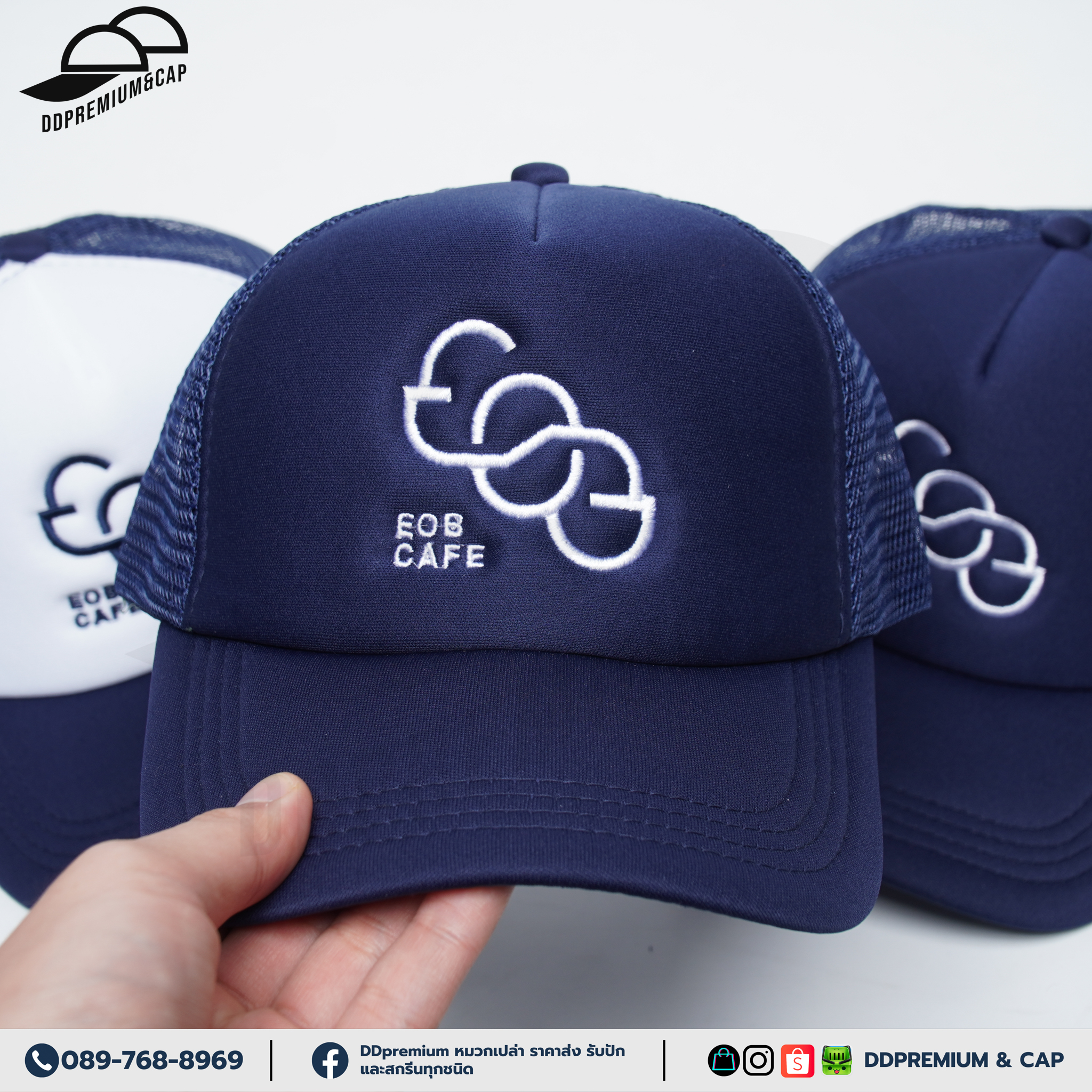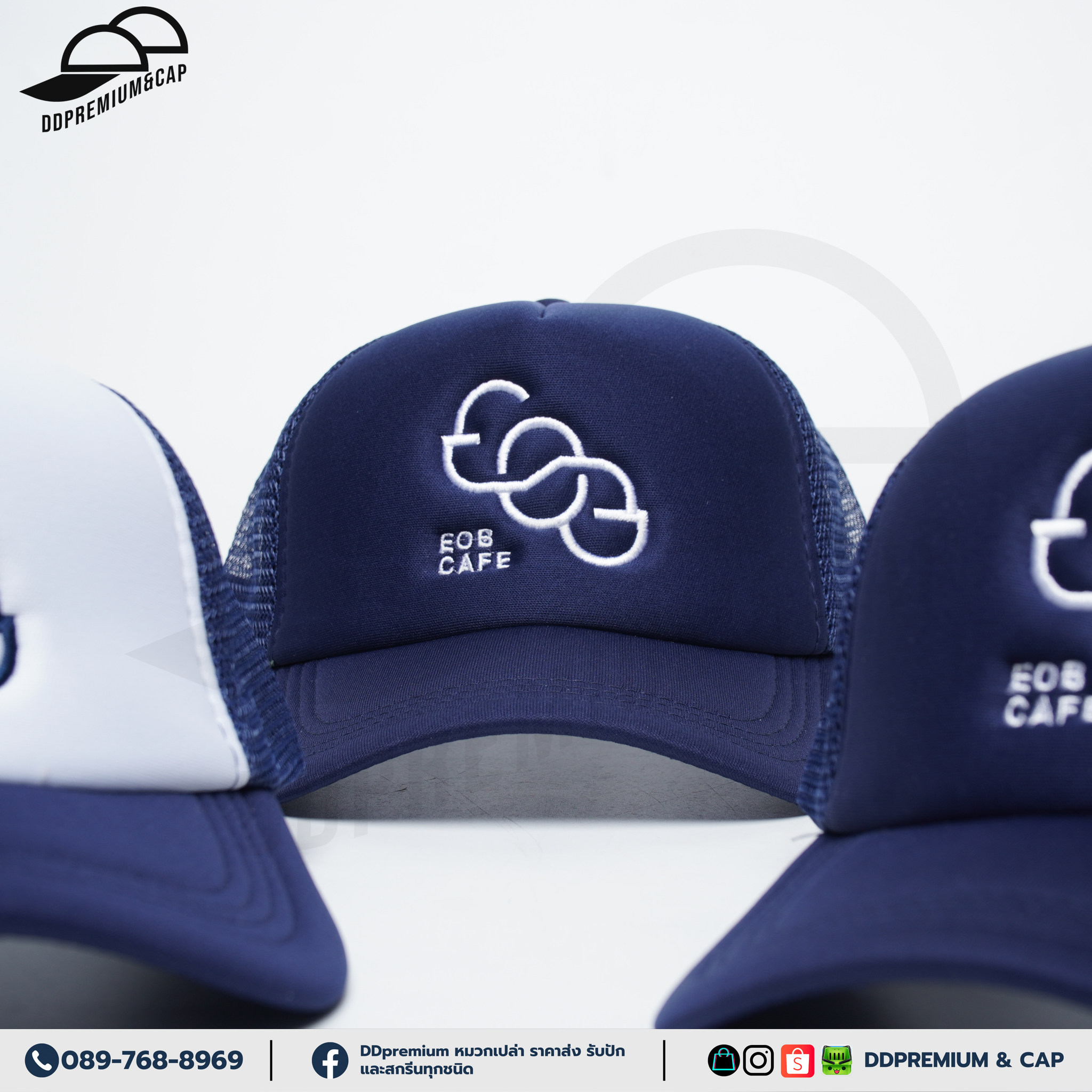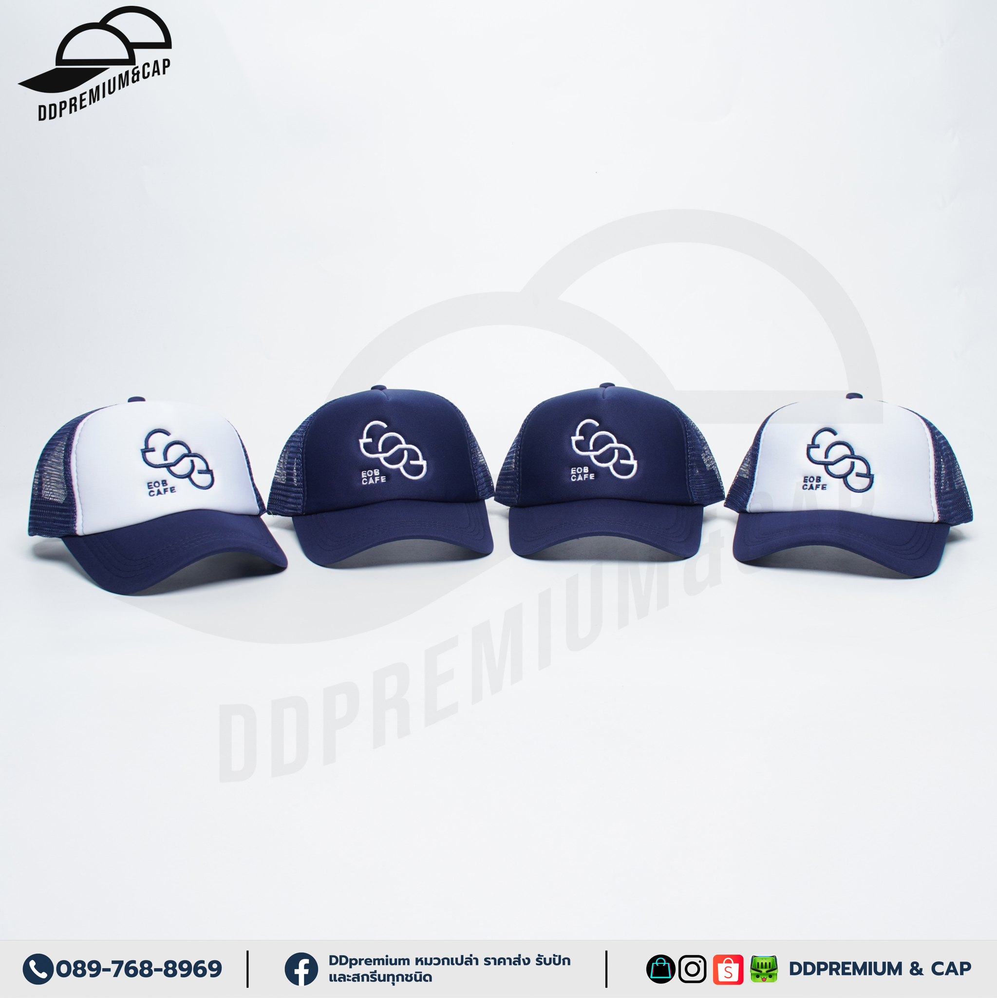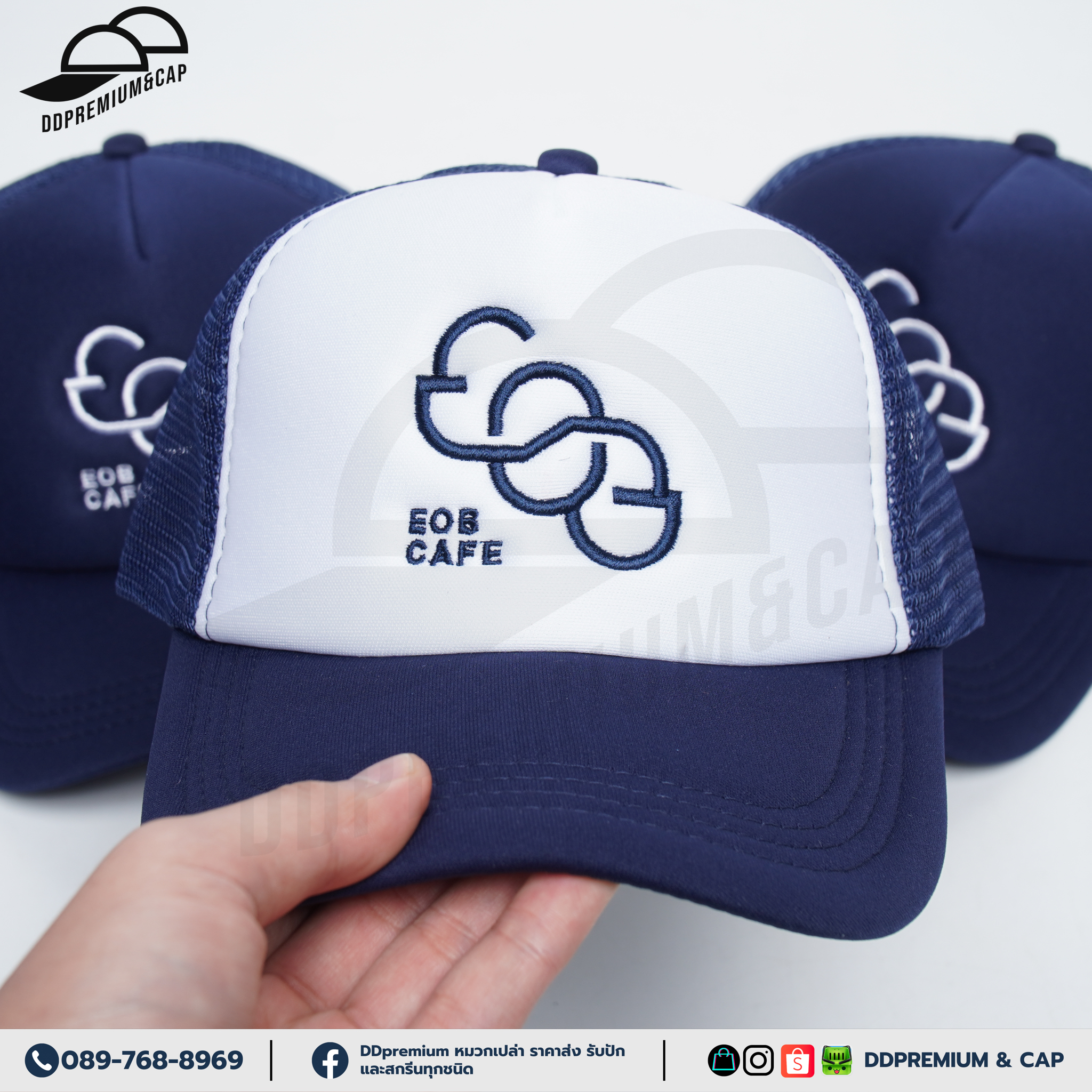 EOB CAFE - หมวกแก๊ปหน้าฟองน้ำหลังตาข่าย พร้อมปักโลโก้ด้านหน้า 1ตำแหน่ง ที่ปรับ Snapback
